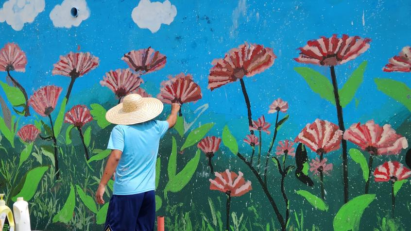 实践团结合村内蘑菇产业、乡容村貌等元素进行墙绘设计,着力展现“一村一品”特色,用画笔因地制宜将乡村产业兴旺、生态宜居、乡风文明等内容,以乡村墙体彩绘等艺术形式展示出来,传承中华民族的优秀传统文化,助力乡村文化建设。经过数日的反复打磨和提升,实践团顺利完成六十余平方米的三面墙绘。