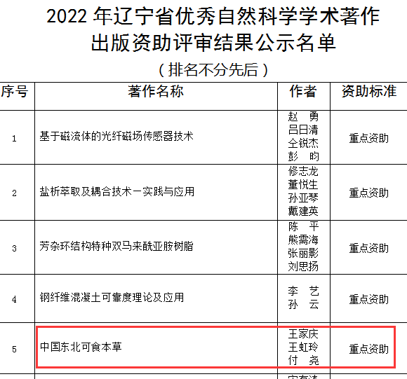日前,辽宁省科学技术协会发布2022年辽宁省优秀自然科学学术著作出版资助评审结果公示名单,由我校生命工程学院王家庆教授、王虹玲副教授、付尧副教授编写,中国农业科学技术出版社出版的编著《中国东北可食本草》获重点资助。